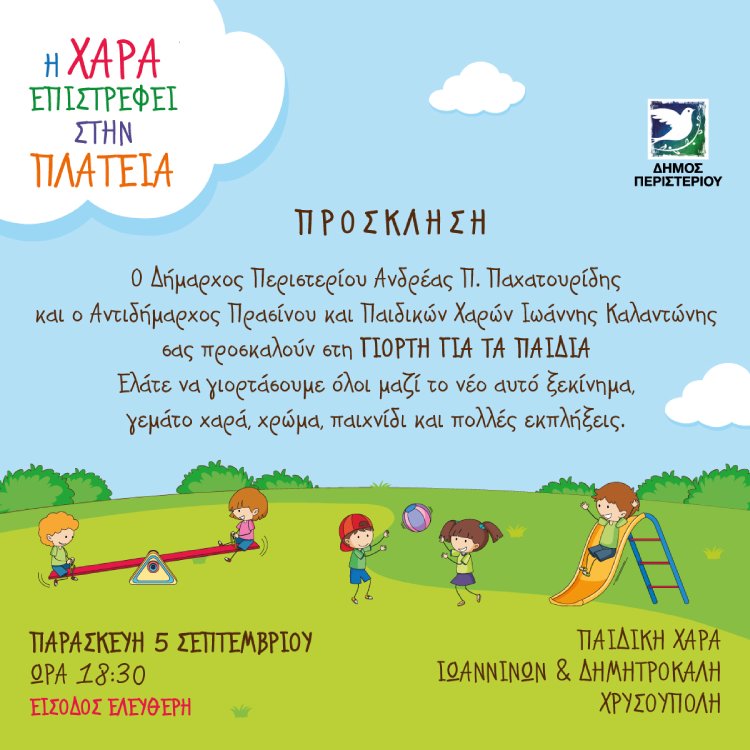 Ο Δήμαρχος Περιστερίου Ανδρέας Π. Παχατουρίδης και ο Αντιδήμαρχος Πρασίνου και Παιδικών Χαρών Ιωάννης Καλαντώνης προσκαλούν μικρούς και μεγάλους στη Γιορτή για τα Παιδιά που θα πραγματοποιηθεί την Παρασκευή 5 Σεπτεμβρίου 2025 και ώρα 18:30 στην αναβαθμισμένη Παιδική Χαρά Χρυσούπολης, στη συμβολή των οδών Αίγλης και Ξενοκράτους. Η συμμετοχή είναι ελεύθερη για όλους.