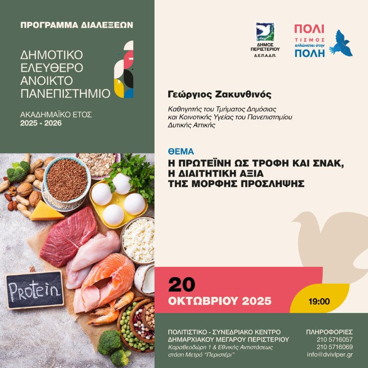 Την ίδια ημέρα, στη θέση της, θα πραγματοποιηθεί διάλεξη με ομιλητή τον κ. Γεώργιο Ζακυνθινό, Καθηγητή του Τμήματος Δημόσιας και Κοινοτικής Υγείας του Πανεπιστημίου Δυτικής Αττικής, με θέμα: «Η πρωτεΐνη ως τροφή και σνακ – η διαιτητική αξία της μορφής πρόσληψης».