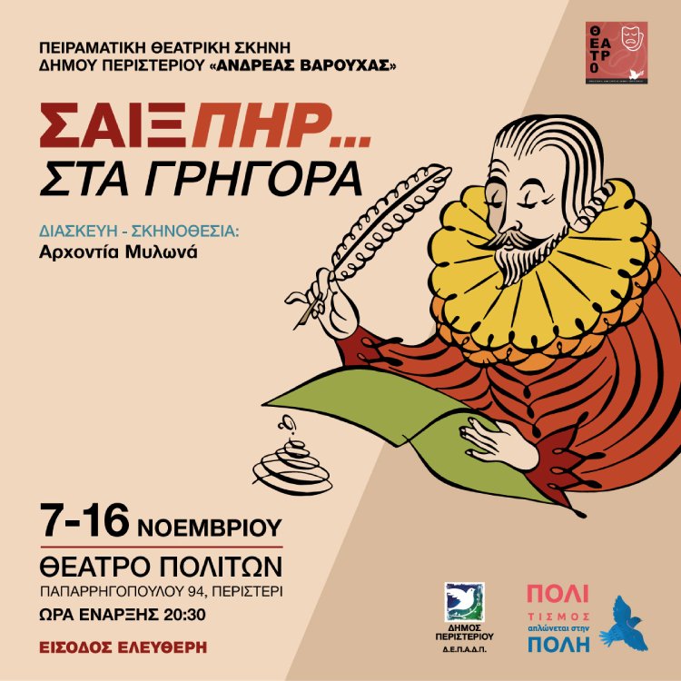 Ο Δήμαρχος Περιστερίου Ανδρέας Π. Παχατουρίδης σας προσκαλεί στη νέα θεατρική παράσταση της Πειραματικής Θεατρικής Σκηνής “Ανδρέας Βαρούχας” του Δήμου Περιστερίου, με τίτλο «ΣΑΙΞΠΗΡ... ΣΤΑ ΓΡΗΓΟΡΑ», σε διασκευή και σκηνοθεσία της Αρχοντίας Μυλωνά.