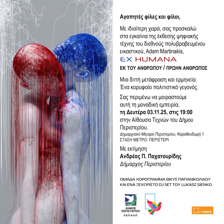 Ο Δήμαρχος Περιστερίου Ανδρέας Π. Παχατουρίδης σας προσκαλεί στα εγκαίνια της έκθεσης ψηφιακής τέχνης EX HUMANA του διεθνώς πολυβραβευμένου εικαστικού Adam Martinakis, που θα πραγματοποιηθούν τη Δευτέρα 3 Νοεμβρίου 2025, στις 19:00, στην Αίθουσα Τεχνών του Δημαρχιακού Μεγάρου Περιστερίου (Καραθεοδωρή 1 – στάση Μετρό «Περιστέρι»). Η είσοδος είναι ελεύθερη για το κοινό.