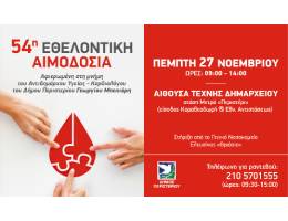 Ο Δήμος Περιστερίου διοργανώνει την 54η Εθελοντική Αιμοδοσία, την Πέμπτη 27 Νοεμβρίου 2025, ώρες 09:00 – 14:00, στην Αίθουσα Τέχνης του Δημαρχιακού Μεγάρου (στάση Μετρό «Περιστέρι», είσοδος Καραθεοδωρή & Εθν. Αντιστάσεως), με τη στήριξη του Γενικού Νοσοκομείου Ελευσίνας “Θριάσιο”.