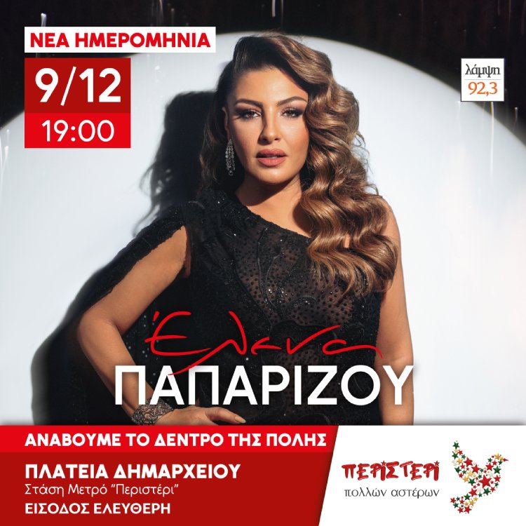 Λόγω της πρόγνωσης για δυσμενείς καιρικές συνθήκες, η επίσημη φωταγώγηση του Χριστουγεννιάτικου Δέντρου της πόλης του Περιστερίου αναβάλλεται για την Τρίτη 9 Δεκεμβρίου 2025, στις 19:00, στην Πλατεία Δημαρχείου (στάση Μετρό «Περιστέρι»). Η είσοδος είναι ελεύθερη.