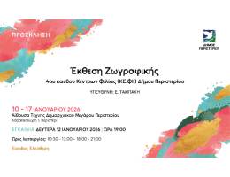 Η έκθεση θα φιλοξενηθεί από 10 έως 17 Ιανουαρίου 2026 στην Αίθουσα Τέχνης του Δημαρχιακού Μεγάρου (Καραθεοδωρή 1 – στάση Μετρό «Περιστέρι»). Υπεύθυνη: Ε. Ταμπάκη.