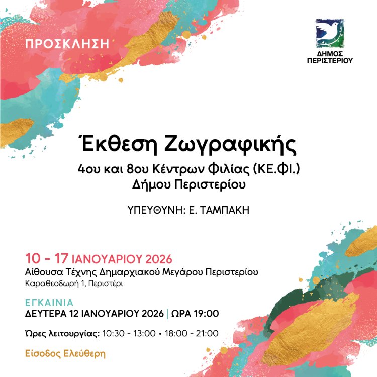 Ο Δήμος Περιστερίου προσκαλεί τους πολίτες στην Έκθεση Ζωγραφικής των 4ου και 8ου Κέντρων Φιλίας (ΚΕ.ΦΙ.), μια δημιουργική συνάντηση τέχνης και έκφρασης που αναδεικνύει το ταλέντο και την ευαισθησία των μελών του.