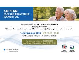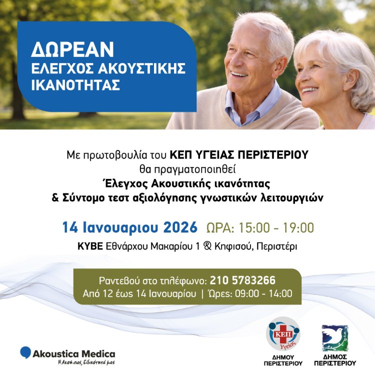 Η δράση θα πραγματοποιηθεί την Τετάρτη 14 Ιανουαρίου 2026, από τις 15:00 έως τις 19:00, στο ΚΥΒΕ (Εθνάρχου Μακαρίου 1 & Κηφισού, Περιστέρι). Η συμμετοχή είναι δωρεάν και απευθύνεται σε πολίτες που επιθυμούν να ελέγξουν προληπτικά την ακοή τους και βασικές γνωστικές λειτουργίες.
