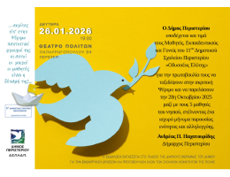 Ο Δήμος Περιστερίου διοργανώνει τιμητική εκδήλωση για τους μαθητές, τους εκπαιδευτικούς και τους γονείς του 11ου Δημοτικού Σχολείου Περιστερίου «Οδυσσέας Ελύτης», αναγνωρίζοντας μια ξεχωριστή πρωτοβουλία με ισχυρό συμβολισμό και βαθύ παιδαγωγικό περιεχόμενο.