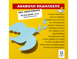 Η εκδήλωση, η οποία είχε προγραμματιστεί για τη Δευτέρα 26 Ιανουαρίου 2026, αναβάλλεται και θα πραγματοποιηθεί τη Δευτέρα 2 Φεβρουαρίου 2026, ώρα 19:00, στο Θέατρο Πολιτών (Παπαρρηγοπούλου 94, Περιστέρι).