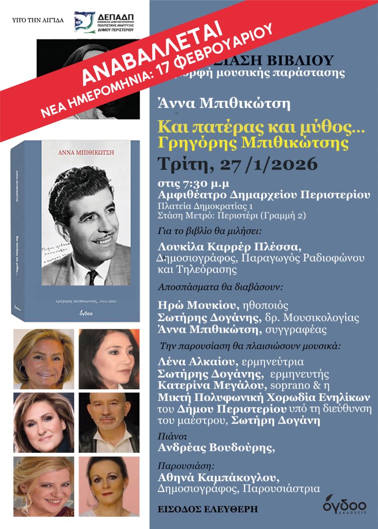 Η προγραμματισμένη για σήμερα, Τρίτη 27 Ιανουαρίου 2026, παρουσίαση του βιβλίου «Και Πατέρας και Μύθος… Γρηγόρης Μπιθικώτσης» αναβάλλεται. Η απόφαση για την αναβολή της εκδήλωσης ελήφθη ως ένδειξη σεβασμού και πένθους για τα θύματα της τραγικής πυρκαγιάς στο εργοστάσιο «Βιολάντα» στα Τρίκαλα.