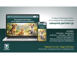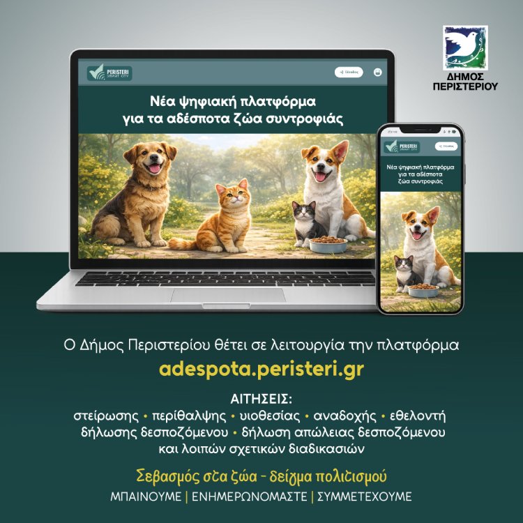 Η Αντιδήμαρχος Κοινωνικής Πολιτικής, Παιδείας, Ισότητας και ΚΕΠ, Μαίρη Τσιώτα - Μάρκου, ανακοινώνει την έναρξη λειτουργίας της νέας ψηφιακής πλατφόρμας adespota.peristeri.gr, με στόχο την αποτελεσματικότερη, σύγχρονη και διαφανή διαχείριση των αδέσποτων ζώων συντροφιάς στον Δήμο Περιστερίου.