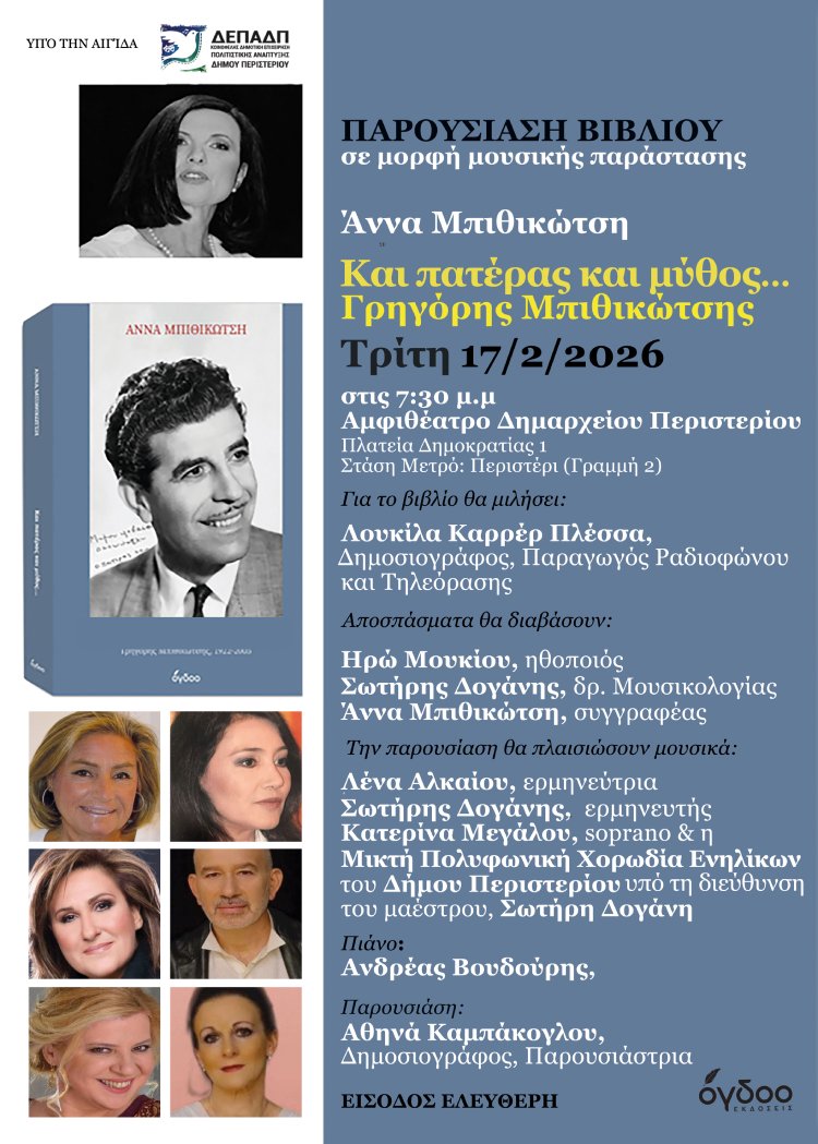 Την Τρίτη 17 Φεβρουαρίου 2026, στις 7:30 μ.μ., το Αμφιθέατρο του Δημαρχείου Περιστερίου θα πλημμυρίσει από τις αναμνήσεις και τους ήχους του ιππότη πενταγράμμου του ελληνικού τραγουδιού, με αφορμή την παρουσίαση του νέου βιβλίου της συγγραφέως Άννας Μπιθικώτση: