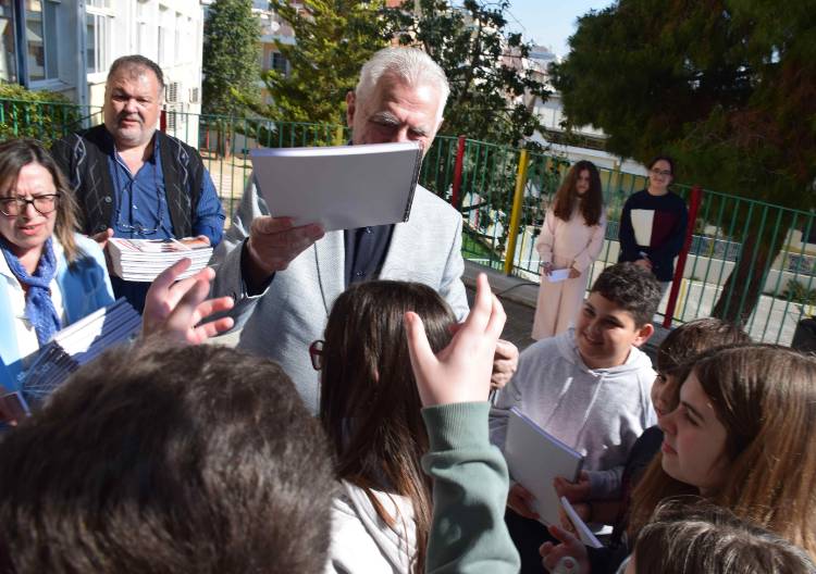 Ο Δήμαρχος Περιστερίου Ανδρέας Π. Παχατουρίδης επισκέφθηκε τα δύο σχολεία και διένειμε προσωπικά τα τετράδια στους μαθητές, συνομιλώντας μαζί τους και αναδεικνύοντας τη σημασία της συνεργασίας, της φιλίας και της ενότητας στη σχολική ζωή.