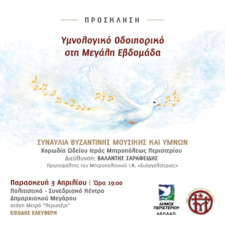 Ο Δήμος Περιστερίου και η Ιερά Μητρόπολη Περιστερίου διοργανώνουν το «Υμνολογικό Οδοιπορικό στη Μεγάλη Εβδομάδα», μια κατανυκτική συναυλία Βυζαντινής Μουσικής και Ύμνων, την Παρασκευή 3 Απριλίου 2026 και ώρα 19:00, στο Πολιτιστικό – Συνεδριακό Κέντρο του Δημαρχιακού Μεγάρου (στάση Μετρό «Περιστέρι»), με ελεύθερη είσοδο για το κοινό.