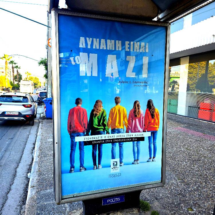 Στο πλαίσιο της δράσης «Δύναμη είναι το Μαζί», το μήνυμα κατά του σχολικού εκφοβισμού αναρτάται στις στάσεις των λεωφορείων σε όλη την Αττική, φτάνοντας καθημερινά σε χιλιάδες πολίτες και αγγίζοντας συνειδήσεις και ζωές.
