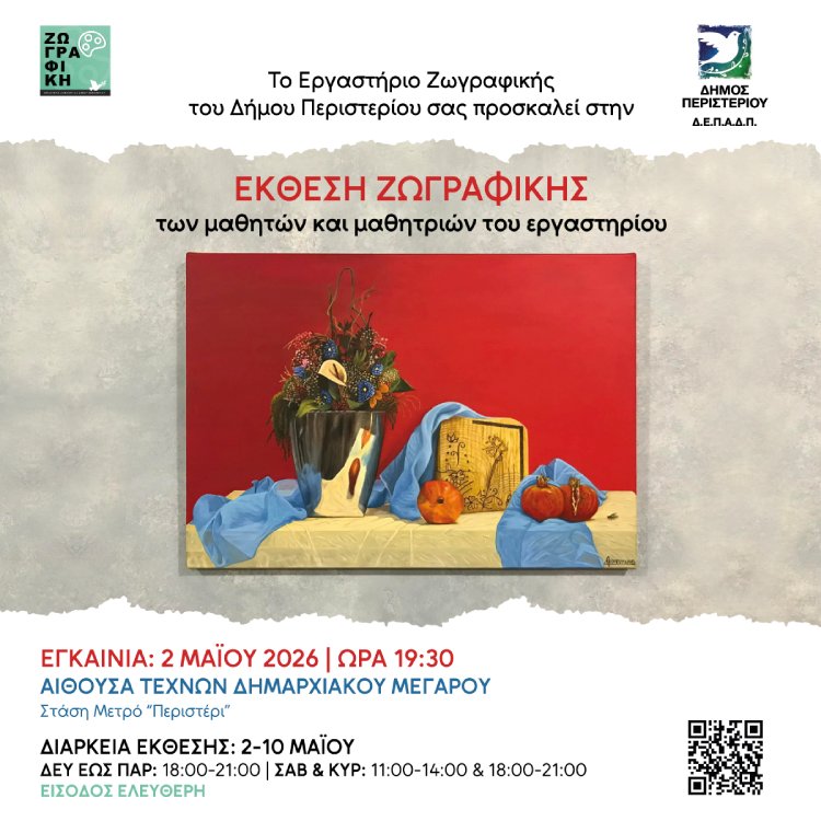 Το Εργαστήριο Ζωγραφικής του Δήμου Περιστερίου, προσκαλεί τους δημότες και τους φίλους της τέχνης στην ετήσια Έκθεση Ζωγραφικής των μαθητών και μαθητριών του εργαστηρίου.